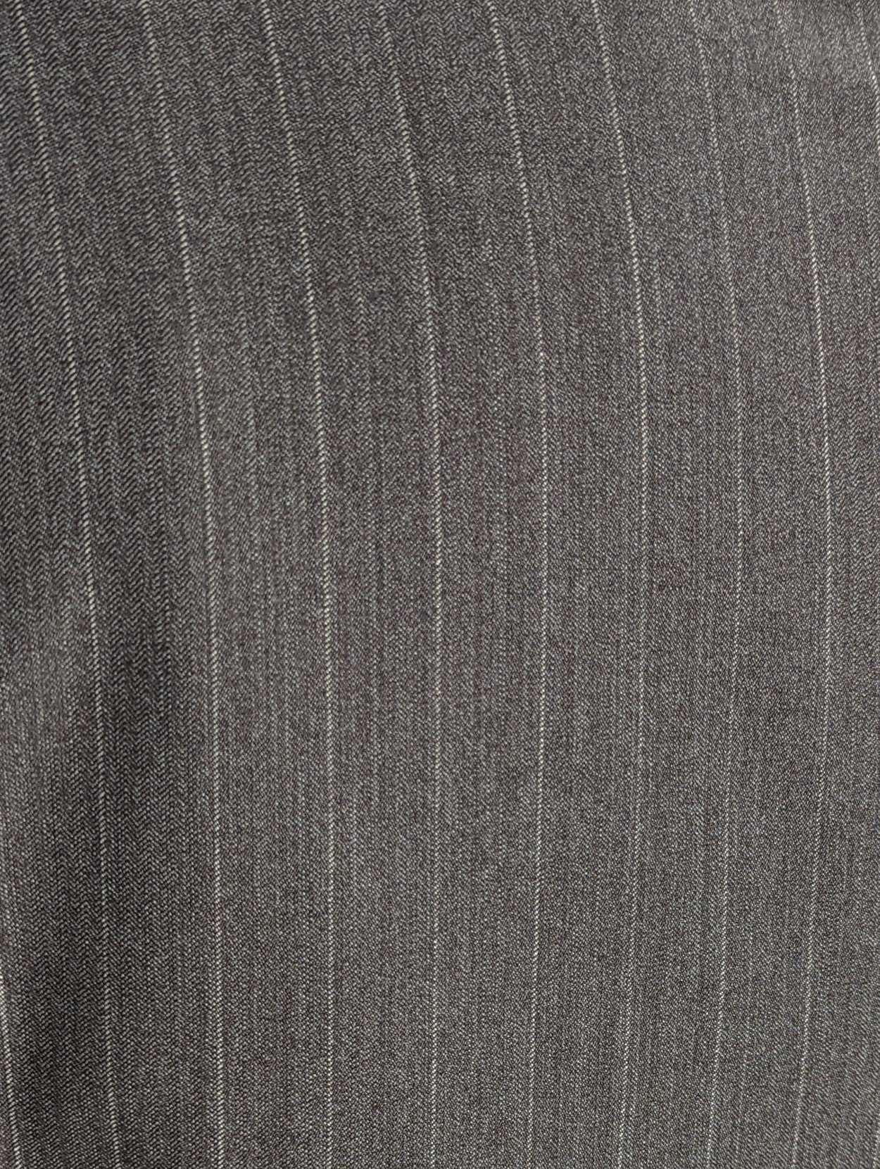 This Armani Collezioni suit is crafted from 100% wool in a refined charcoal tone with subtle pinstripes, offering a timeless and professional look. The fully canvassed, fully lined jacket features a two-button front, notch lapels, besom pockets, and dual side vents for a clean, structured silhouette. Matching flat-front trousers are unhemmed and ready for tailoring. A versatile choice for business or formal occasions.