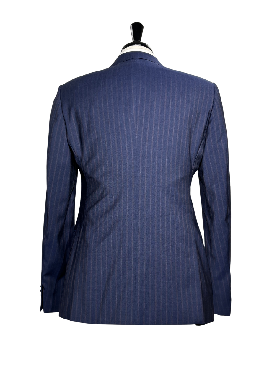 This Armani Collezioni blue with burgundy pinstriped suit blends classic tailoring with modern elegance. It features a notch lapel, two-button closure, and dual vents for comfort and style. A sharp choice for business or formal wear.