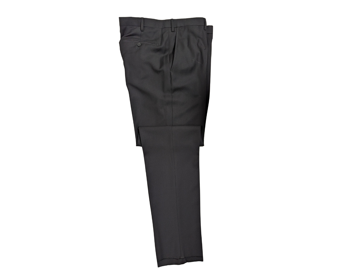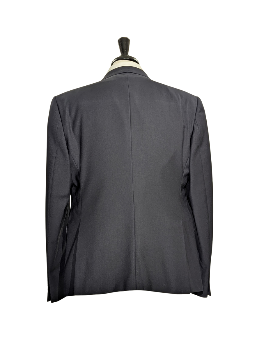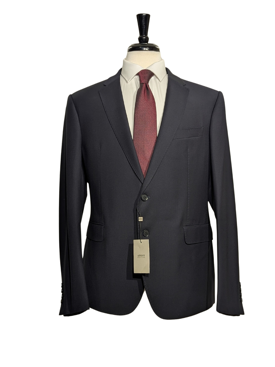 Elevate your formalwear with this impeccably tailored Armani Collezioni solid black suit, crafted from a luxurious wool for a refined texture and soft drape. The jacket is styled with a notch lapel, a 2-button front closure, and dual rear vents. Ideal for business professionals, weddings, and upscale events.