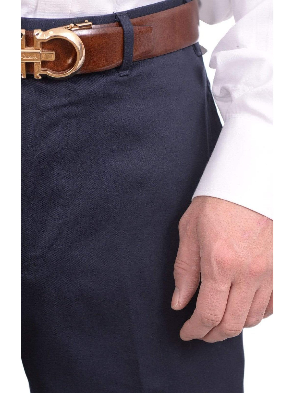 Bloomindales Classic Fit Solid Navy Blue Flat Front Cotton Dress Pants