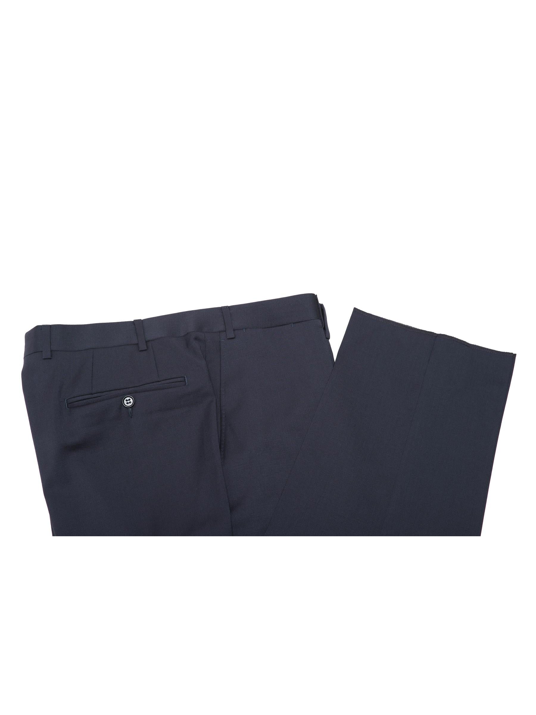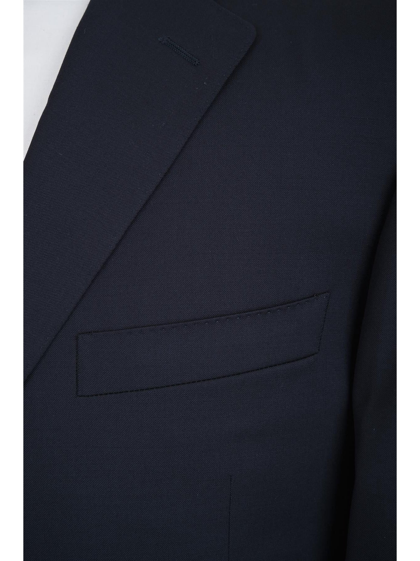 This elegant modern fit navy blue 100% wool suit features full-canvassed construction and fine tailoring. It is the perfect suit for special occasions or business wear. With its impeccable Italian tailoring, this suit is the epitome of effortless style. Immerse yourself in luxury, knowing that every stitch has been carefully designed, every seam meticulously tailored.