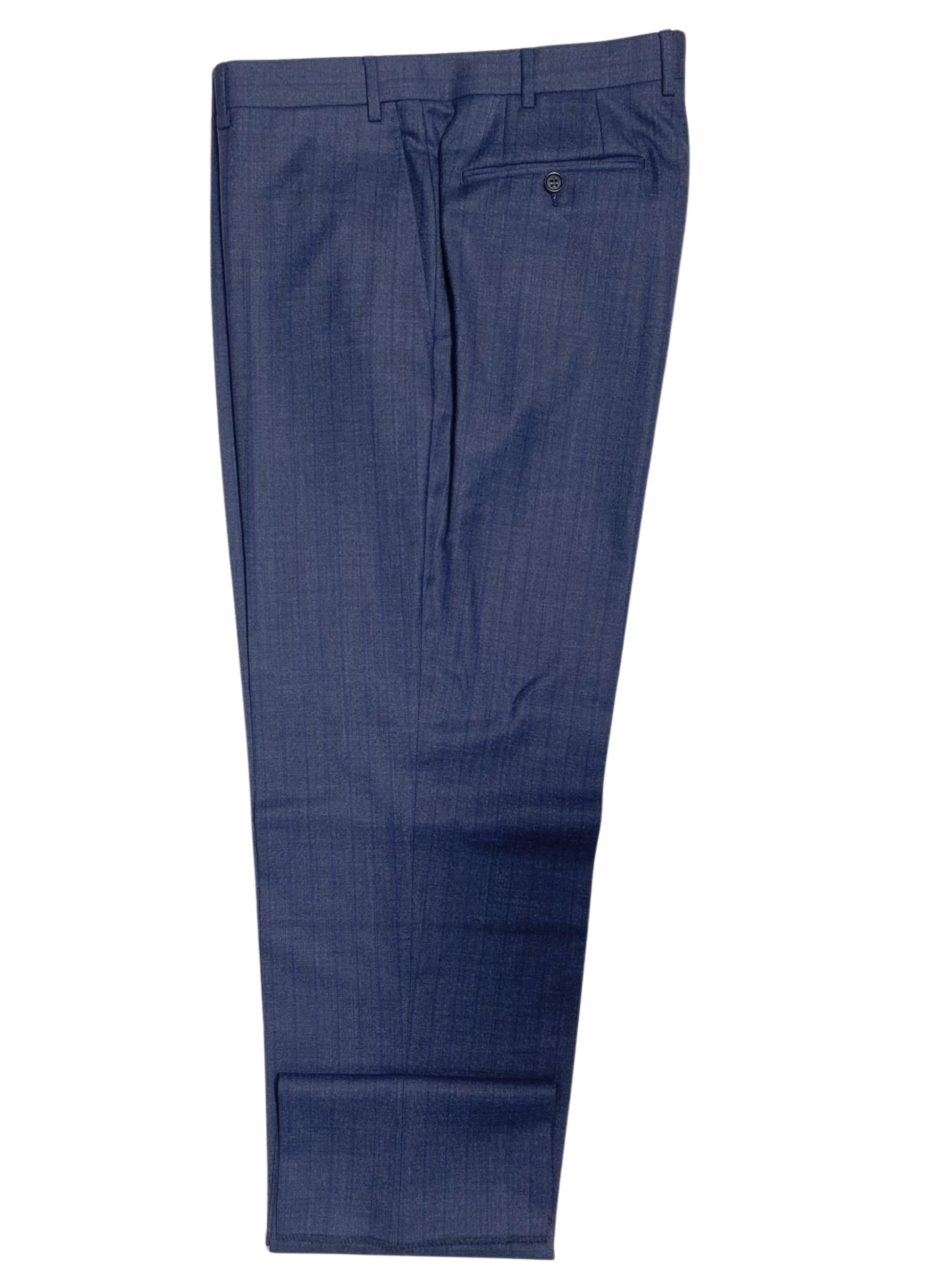 This Canali blue pinstriped suit is crafted from 100% wool. It features a notch lapel, two-button front, and side vents for comfort and mobility. The pinstriped pattern adds depth without overpowering, making it ideal for both business and formal wear. Finished with flap pockets and flat-front trousers, this suit reflects timeless Italian tailoring.