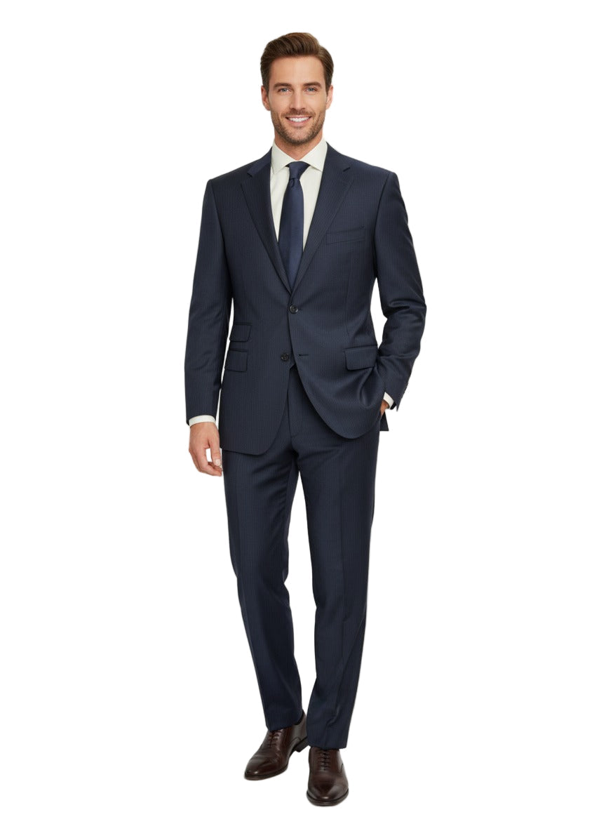 This Canali navy pinstripe suit captures the essence of refined Italian tailoring. Crafted from luxurious 100% pure wool, the fabric offers a smooth, breathable finish and an elegant drape that moves with ease. The classic navy base is accented with subtle pinstripes, adding depth and visual interest without overpowering the look. The jacket features a timeless 2-button front, notch lapels, and lightly structured shoulders for a clean, authoritative silhouette. Dual side vents ensure comfort and mobility, while the matching flat-front trousers deliver a modern, streamlined fit. Fully lined and finished with meticulous attention to detail, this Canali suit is an essential for the gentleman who values sophistication, quality, and enduring style.