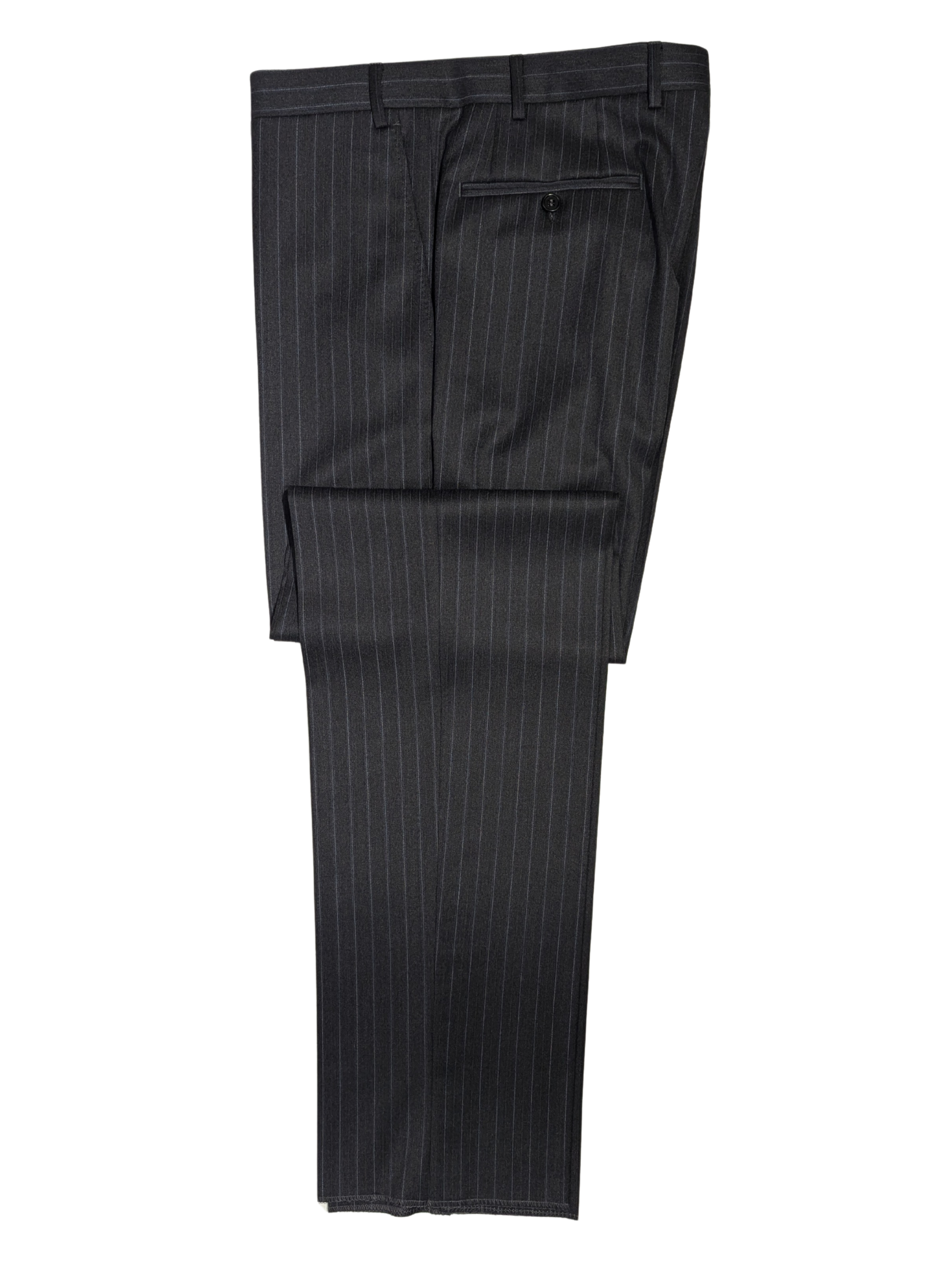 This Canali charcoal pinstripe wool suit delivers timeless elegance with a bold, confident edge. Crafted in Italy from premium wool, the fabric features classic light chalk pinstripes against a deep charcoal base—ideal for formal occasions or commanding business attire. The jacket is fully canvassed for long-lasting shape and structure, featuring sharp peak lapels, a single rear vent, and full lining for comfortable wear. A two-button front and tailored silhouette enhance its classic-meets-modern appeal. Paired with flat-front trousers, this suit reflects Canali’s dedication to precision, luxury, and sartorial excellence.