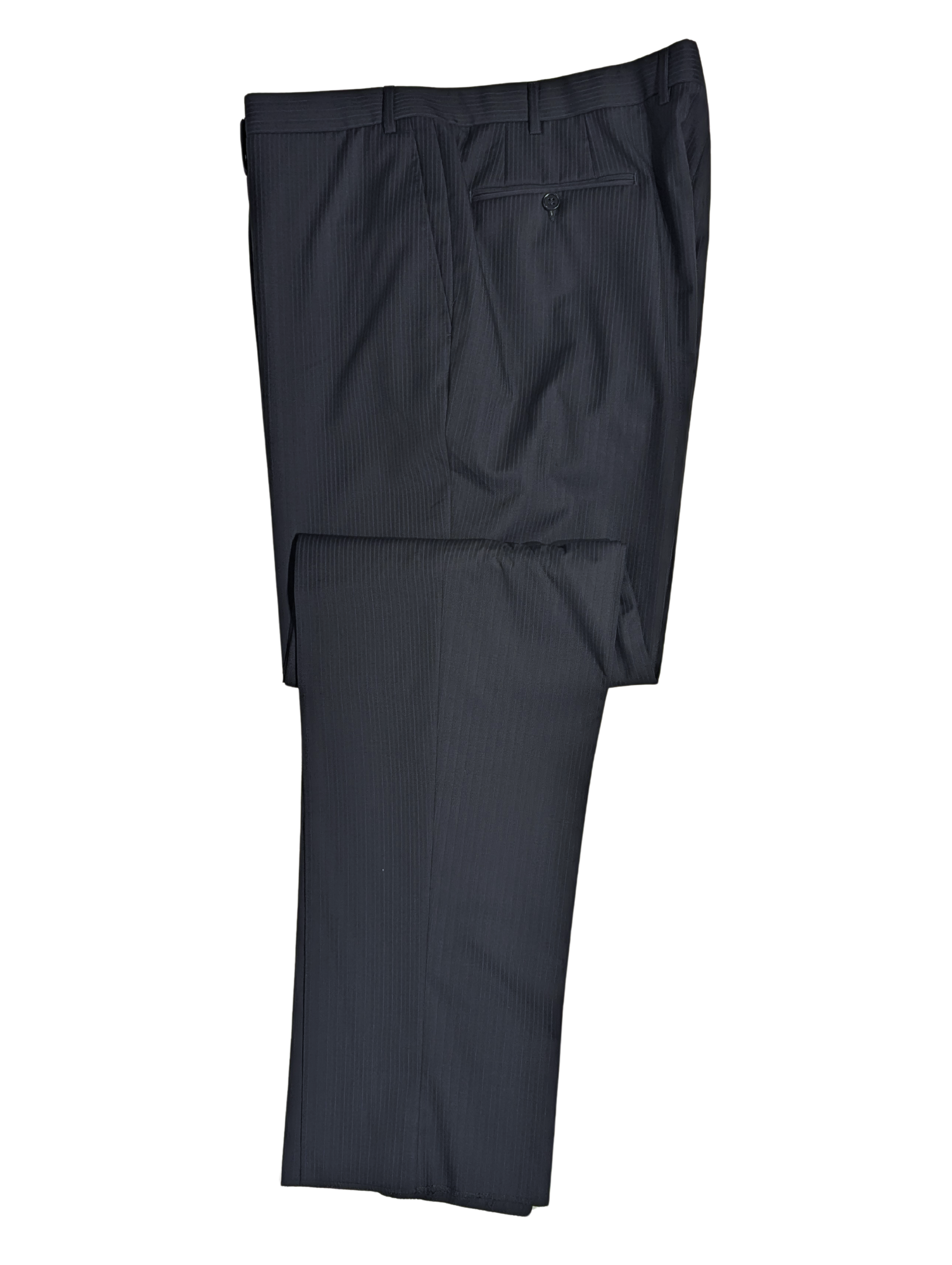 This Canali navy pinstriped suit offers refined Italian craftsmanship with understated elegance. Woven from 100% wool, the fabric features subtle tonal stripes that add depth and dimension while maintaining a sophisticated, professional appearance. The fully-canvassed jacket ensures excellent shape and structure, complete with a two-button front, notch lapels, full lining, and dual side vents for comfort and mobility. Paired with flat-front trousers, this suit is ideal for business, formal occasions, or any event requiring timeless style. Designed and tailored in Italy, this suit reflects Canali’s dedication to quality and attention to detail.