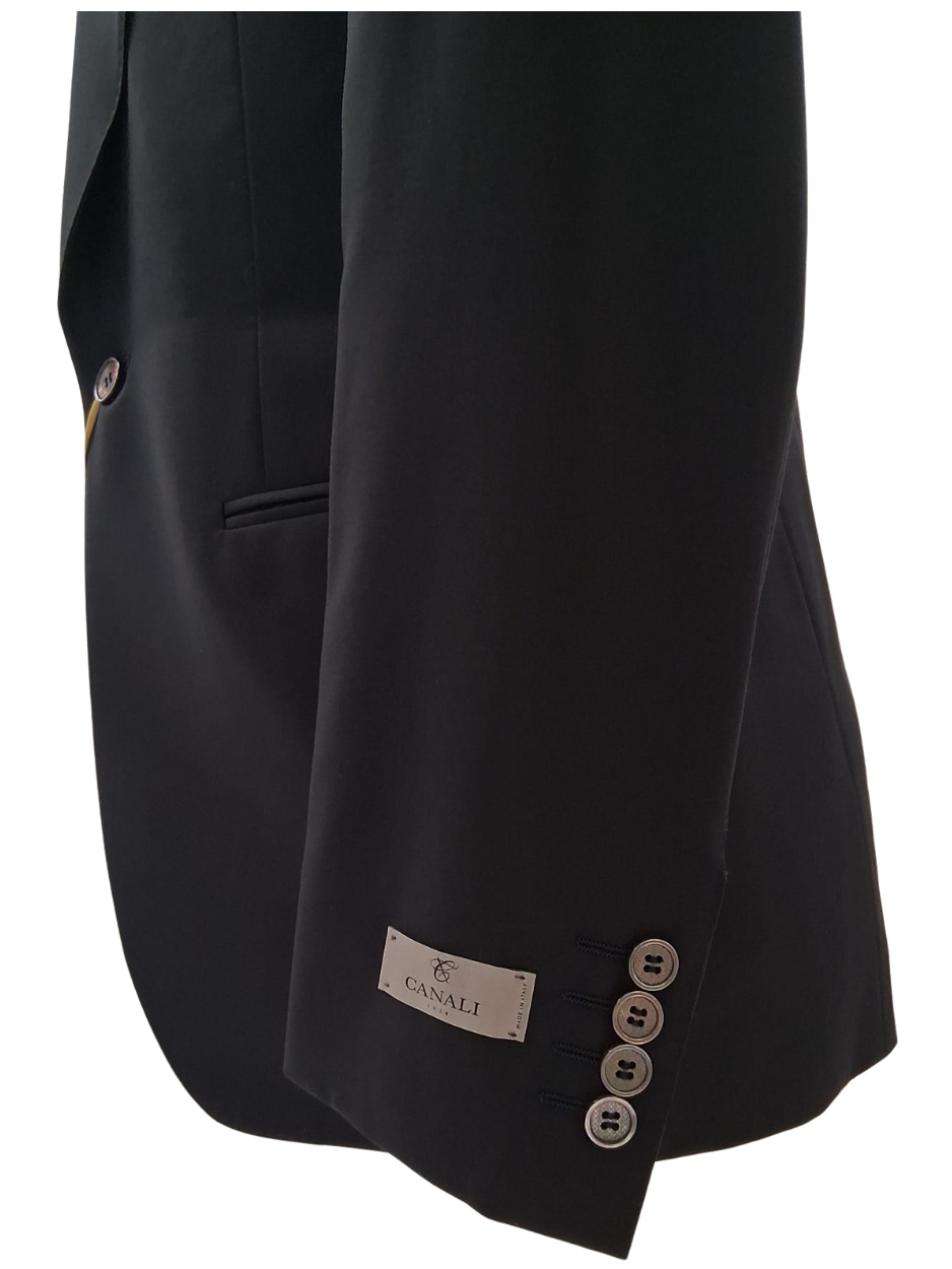 Refine your formal wardrobe with this Canali black 3-piece suit, a pinnacle of Italian tailoring and understated luxury. Expertly crafted from 100% wool, this ensemble features a fully canvassed construction that enhances structure, ensures breathability, and maintains an elegant silhouette. The 1-button single-breasted jacket is adorned with mother-of-pearl buttons and showcases refined welt pockets and shawl lapels.