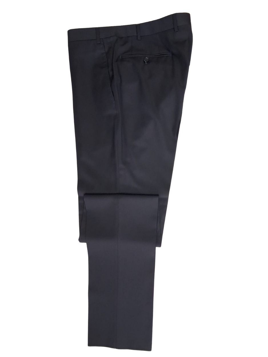 - Flat-front trousers, unhemmed for personalized tailoring.