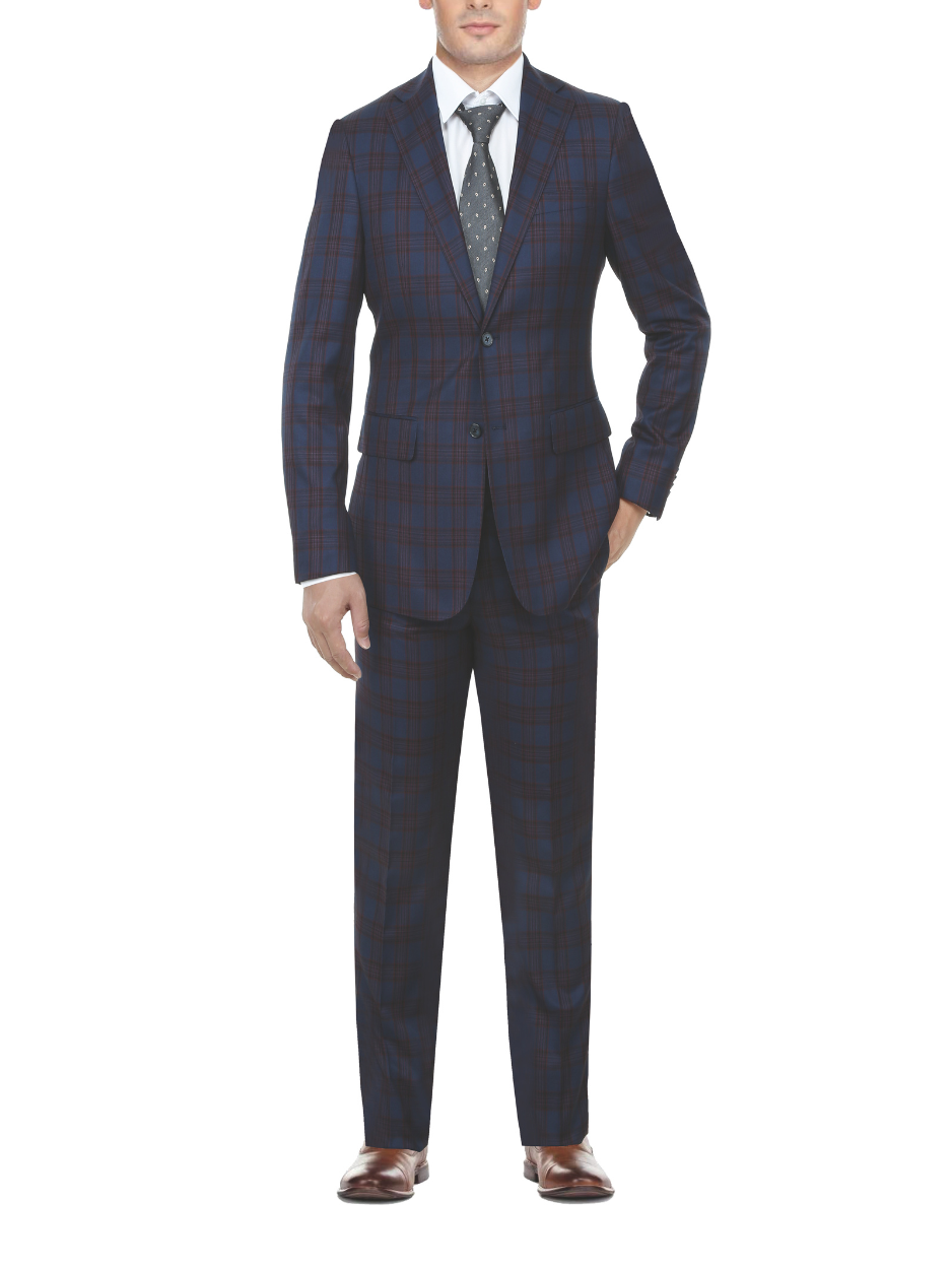English Laundry Glen Plaid Blue & Rust Slim Fit Notch Lapel 2 Button Stretch Suit