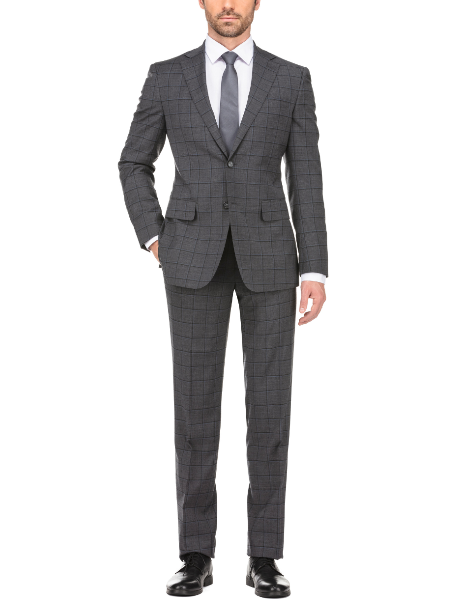 English Laundry Grid Check Charcoal Gray Slim Fit Notch Lapel Wool Stretch 2 Button Suit