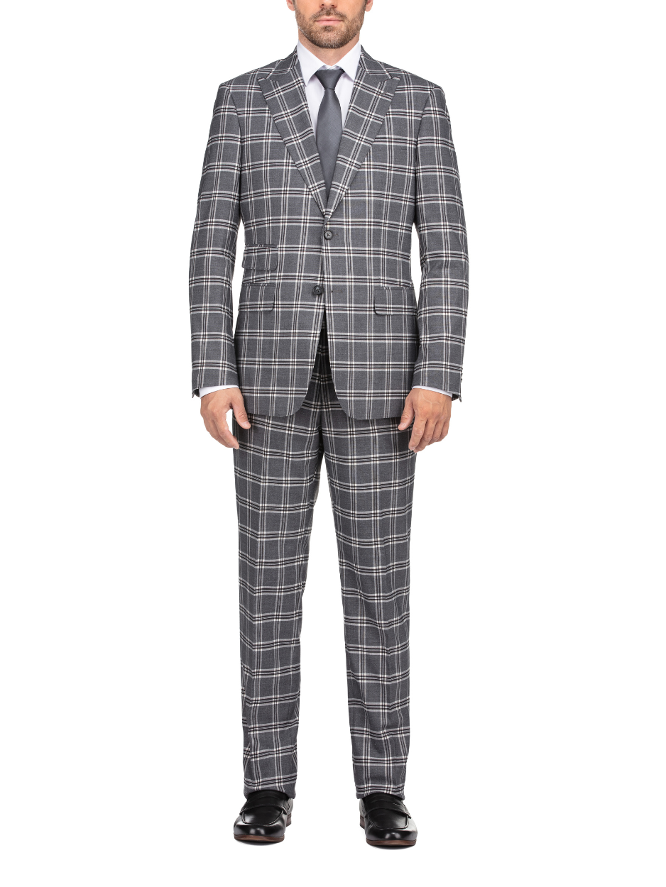 English Laundry Windowpane Check Gray Slim Fit Peak Lapel Stretch 2 Button Suit
