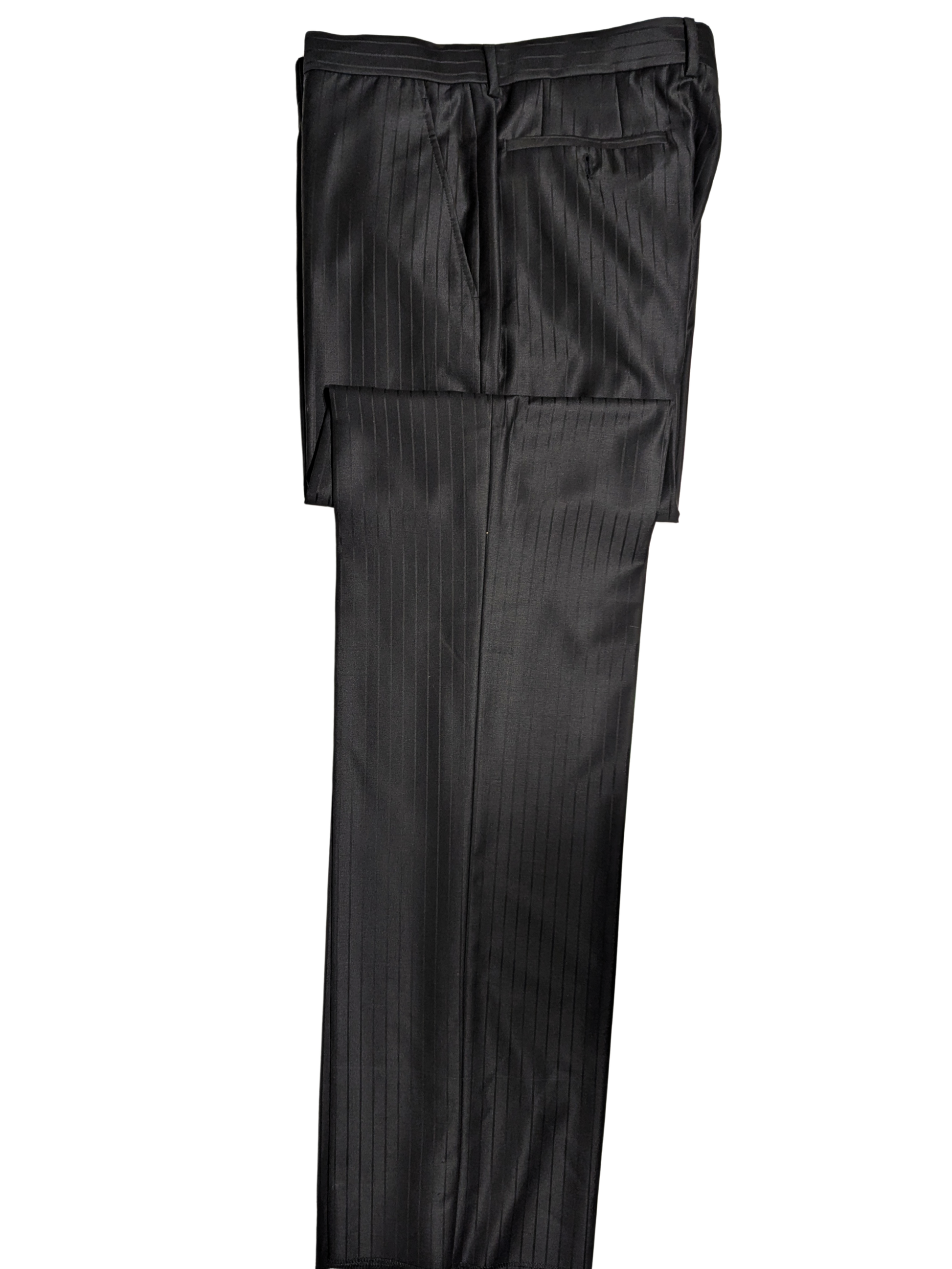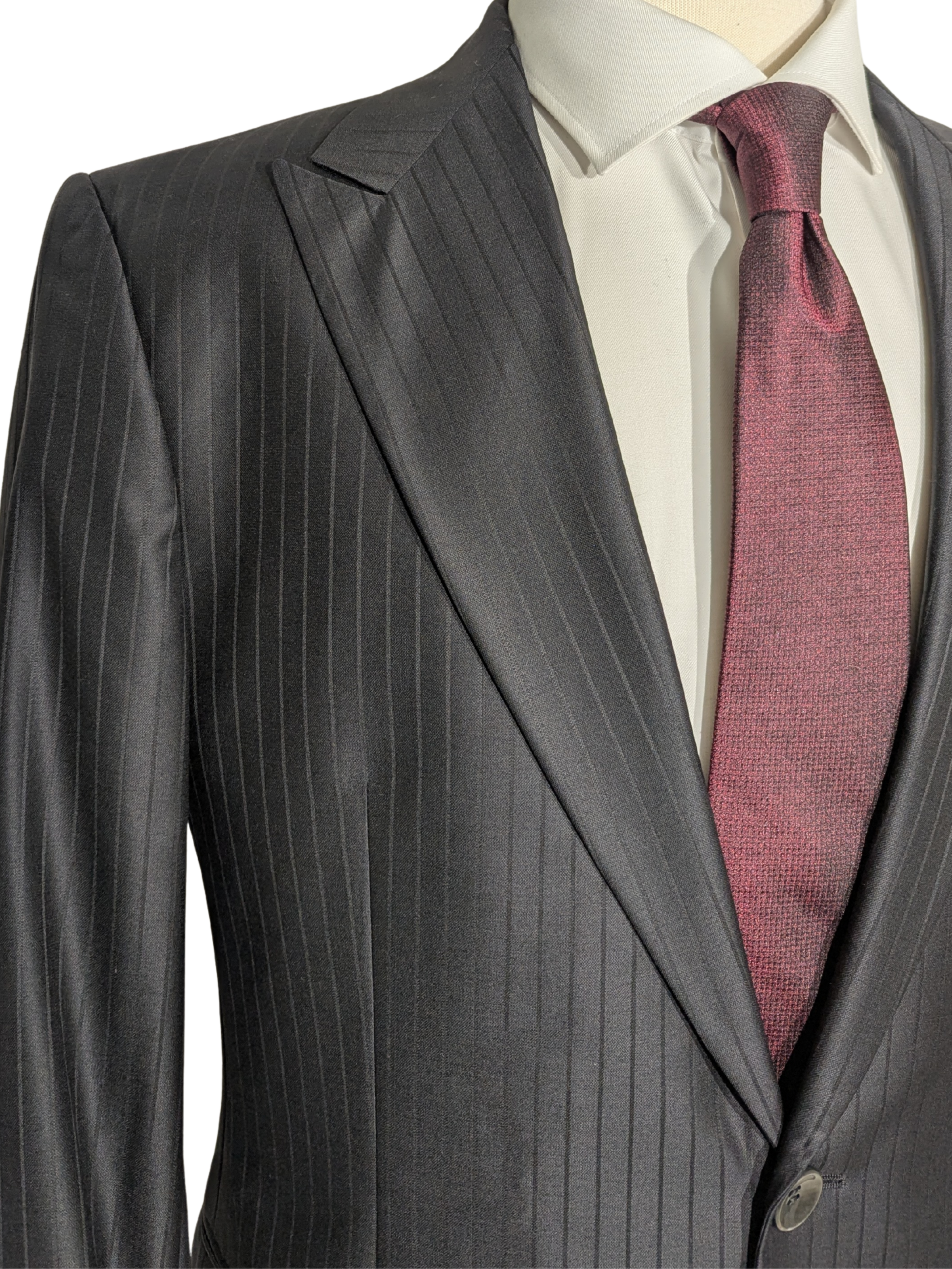 - Black wool suit with subtle vertical pinstripe pattern