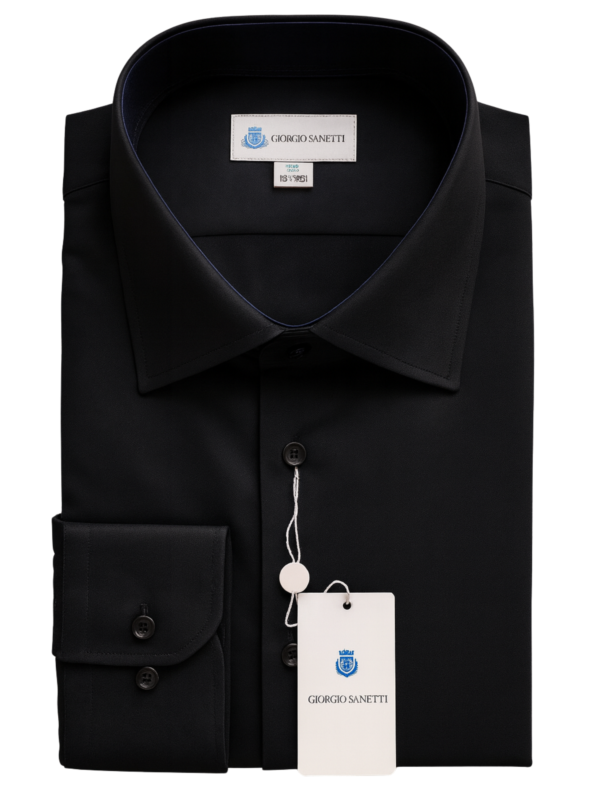 This Giorgio Sanetti black dress shirt is crafted from a breathable bamboo blend with added stretch for comfort. It features a modern spread collar, barrel cuffs, and a clean front placket for a refined look. The soft fabric offers moisture-wicking performance and a smooth hand feel, making it ideal for work or formal occasions.
