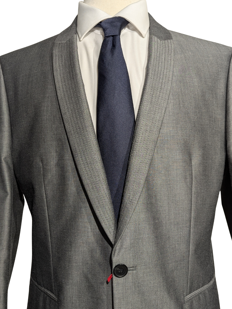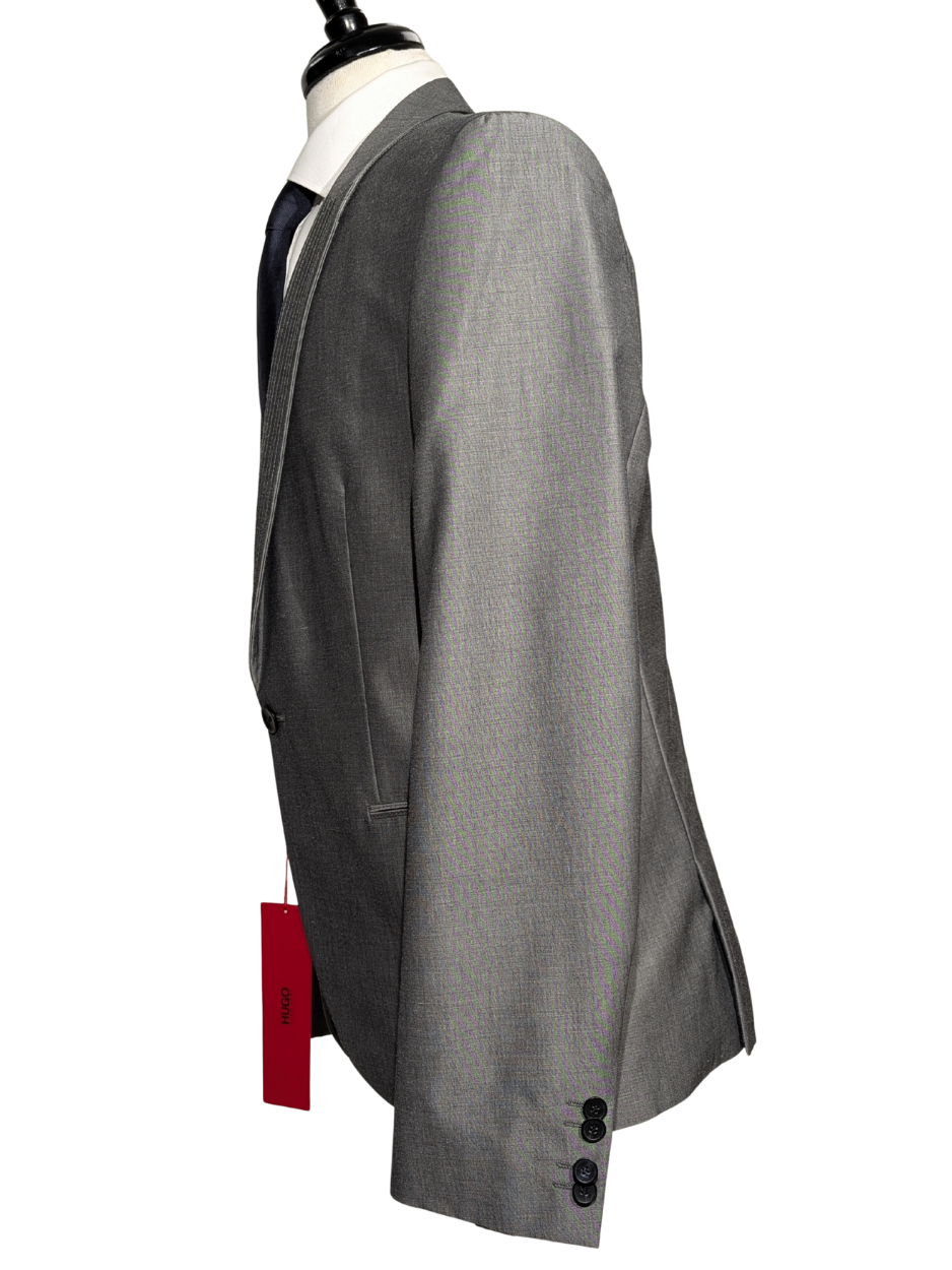 This Hugo Boss tuxedo combines contemporary design with a refined fabric blend of cotton and mohair, Tailored in a slim fit it delivers a smooth drape and a touch of natural luster. The textured gray fabric adds subtle depth, while shawl lapels and a single- front button create a timeless, tailored look. Ideal for business or formal occasions, it’s a refined wardrobe essential with modern appeal.