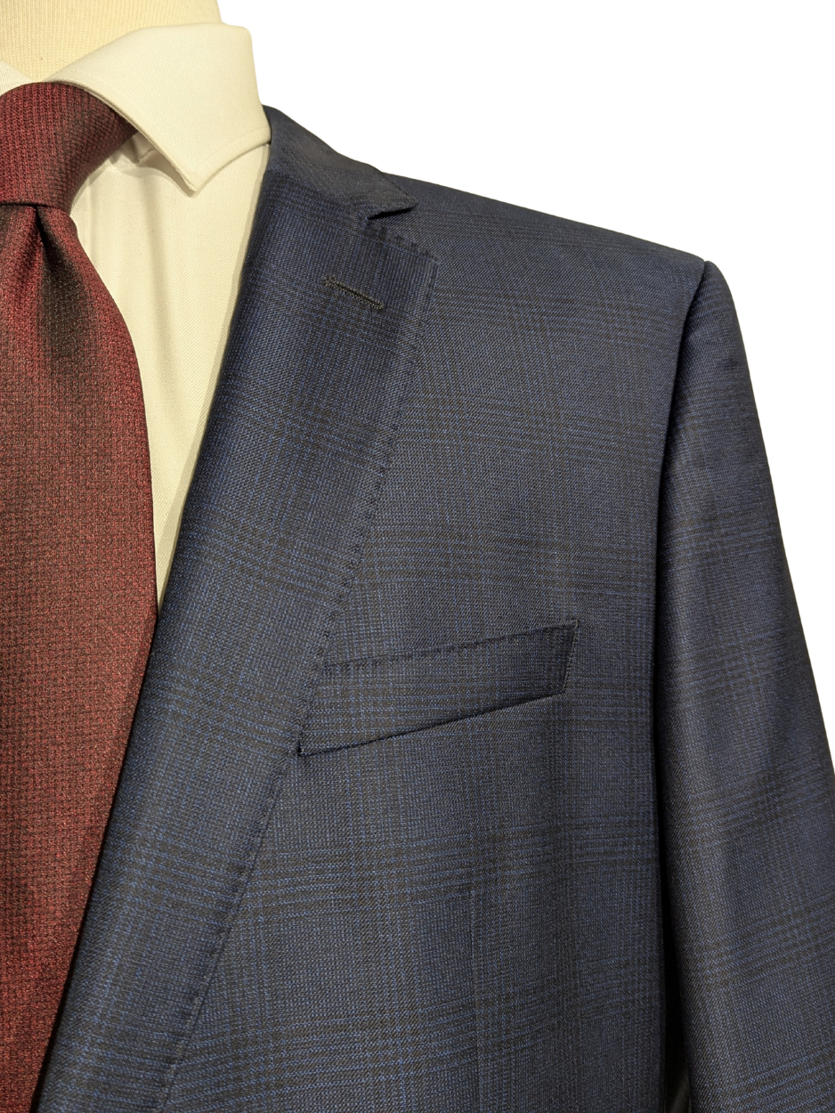 This Hugo Boss suit is crafted from luxurious Super 120s wool by Drago, offering a soft hand feel with excellent drape and durability. The plaid windowpane navy fabric adds subtle depth, while notch lapels and a 2-button front create a timeless, tailored look. Ideal for business or formal occasions, it’s a refined wardrobe essential with modern appeal.