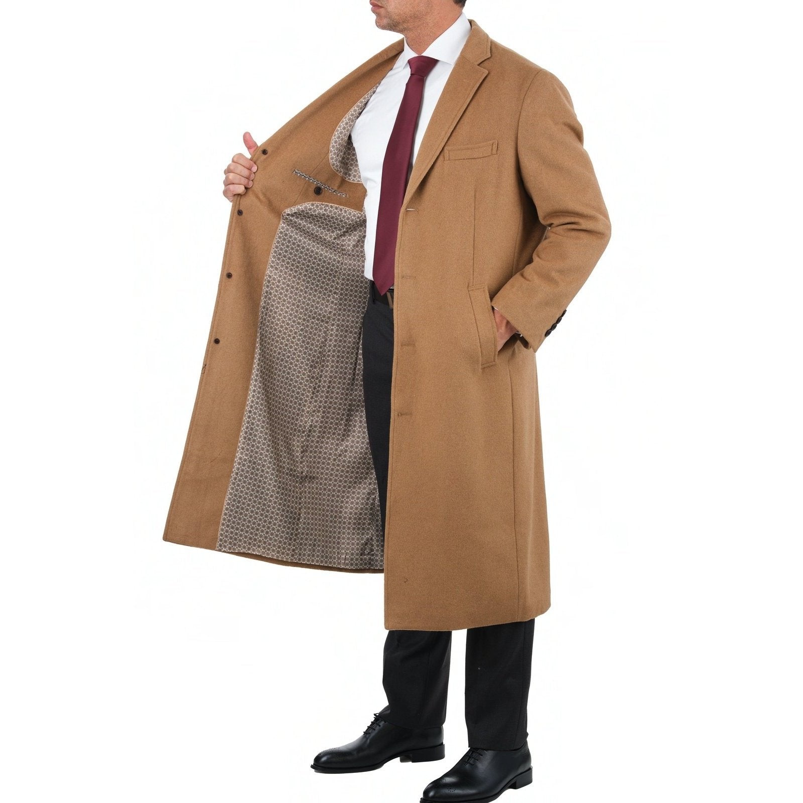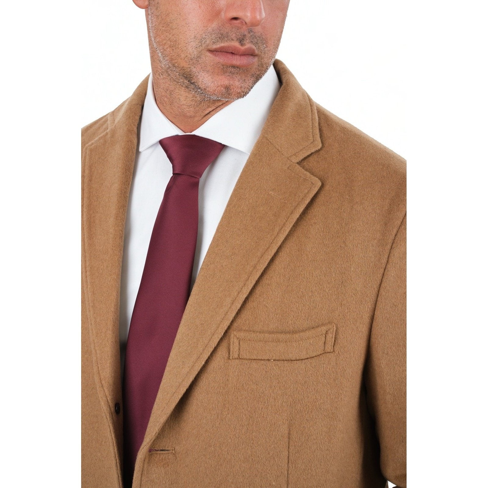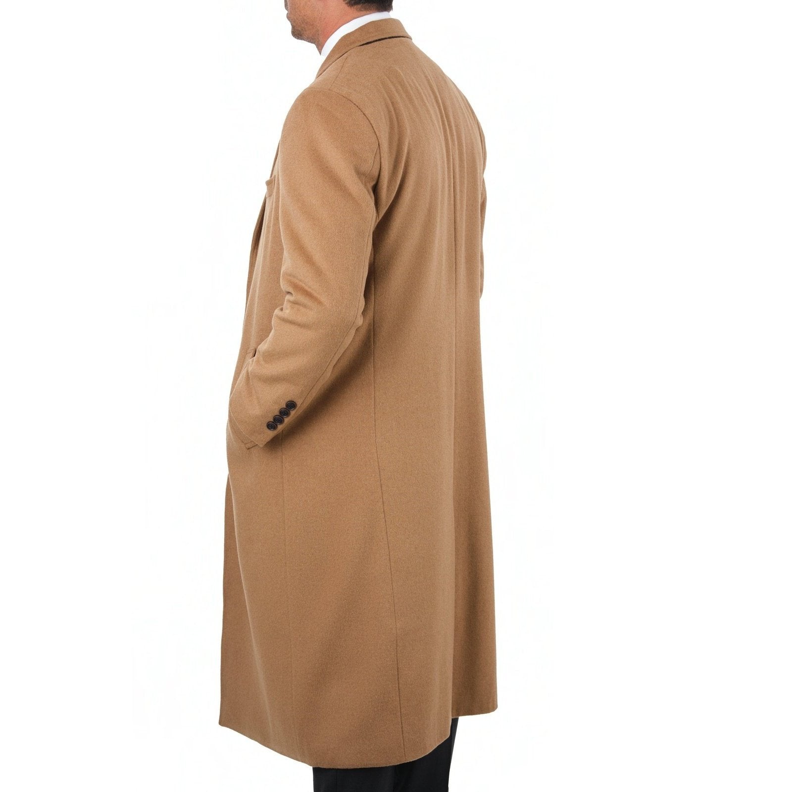 Mens Regular Fit Solid Camel Tan Full Length Wool Cashmere Overcoat Top Coat