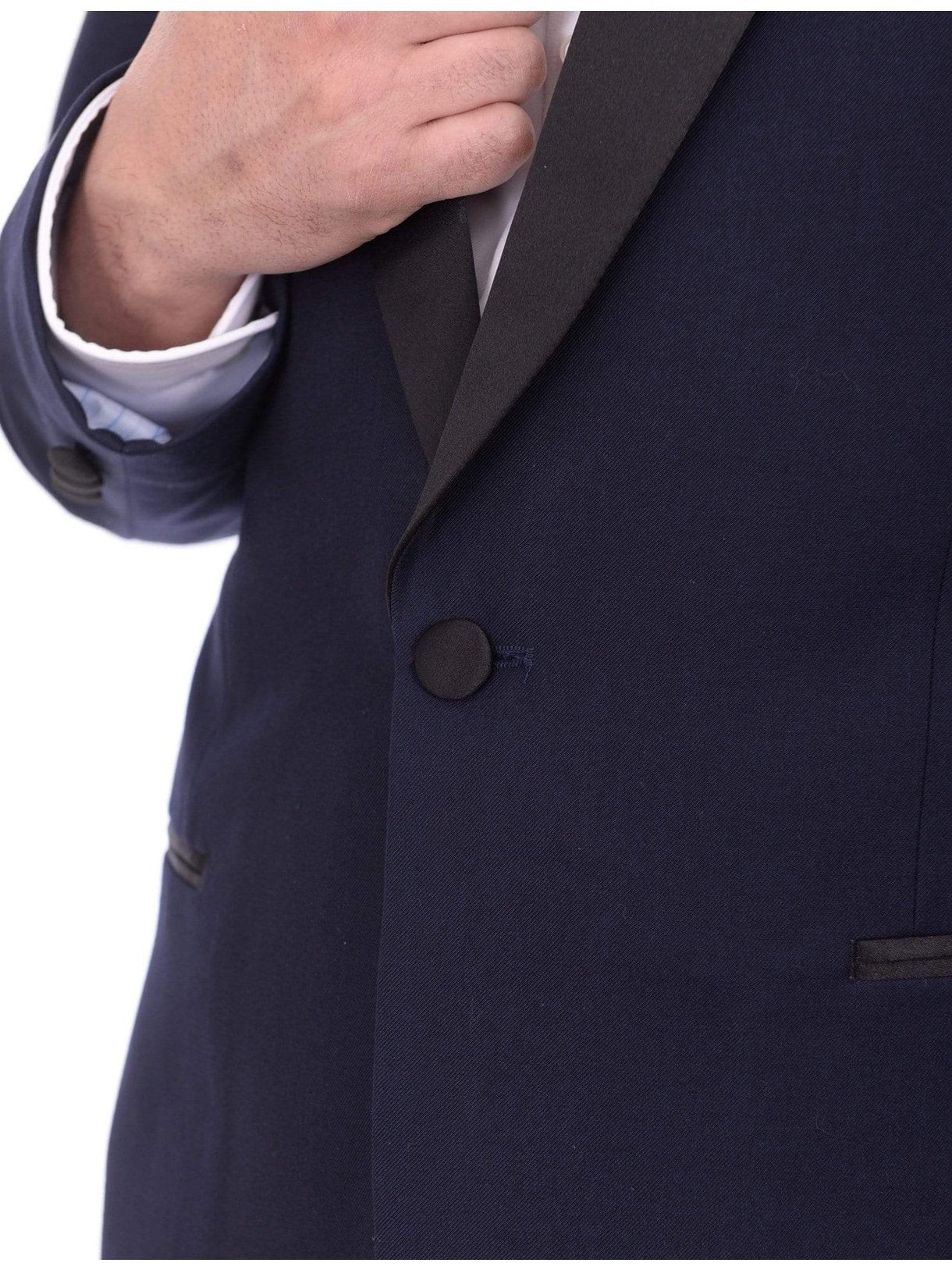 Mens Slim Fit Navy Blue One Button Tuxedo Suit With Black Satin Shawl Lapel