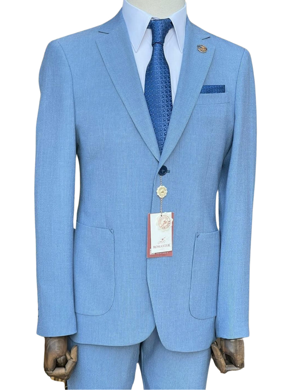 Step into effortless style with this light blue pinstriped suit, tailored for modern sophistication. Made from a 90% linen, 10% Lycra blend for breathable comfort and light stretch. Slim fit with notch lapel and patch pockets for a relaxed, refined look. Ideal for summer events, travel, and elevated casual wear.