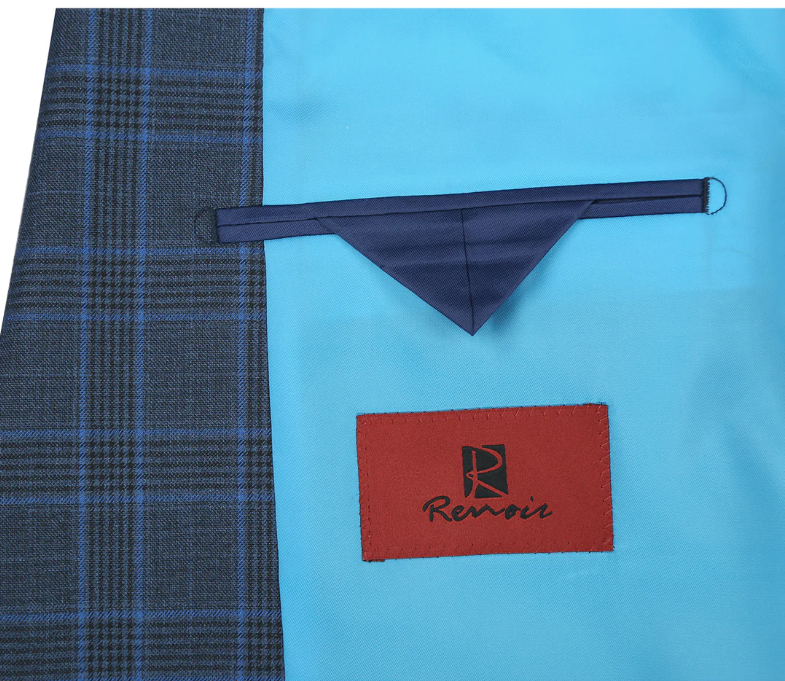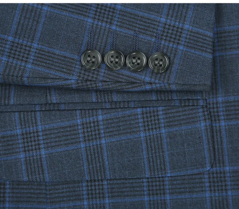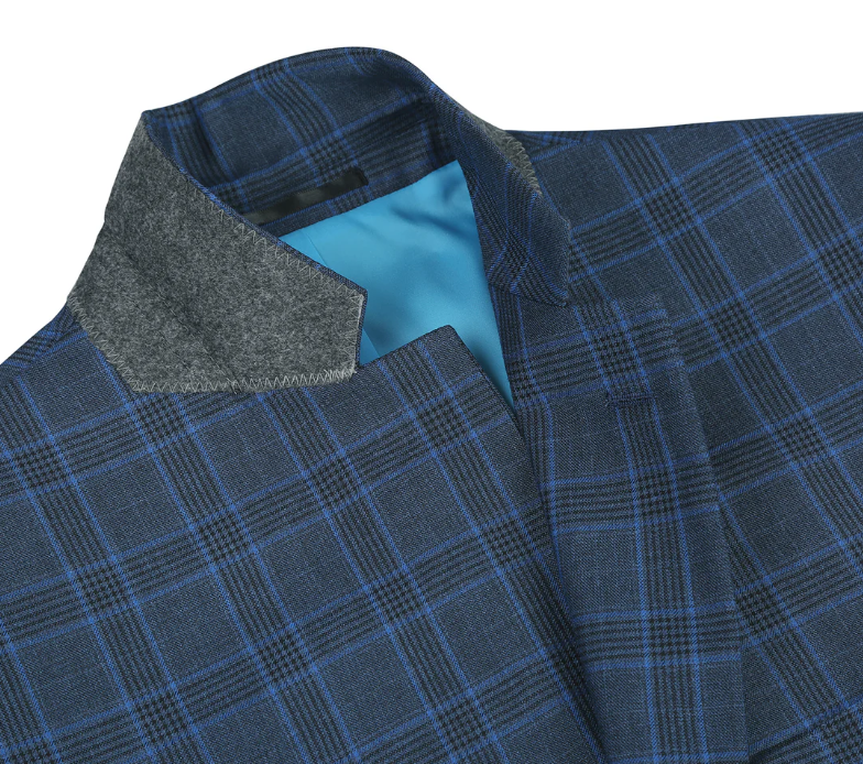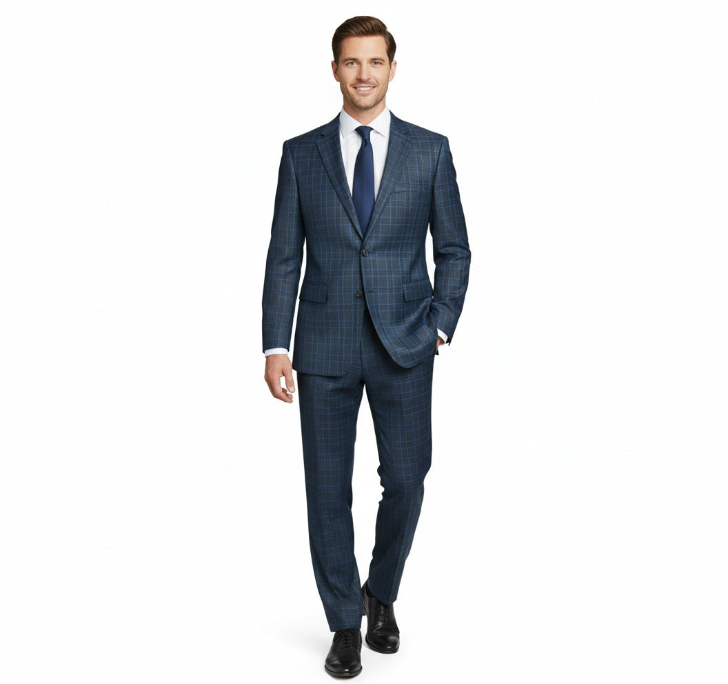 This classic fit suit offers a timeless, comfortable silhouette with a refined blue windowpane check pattern. The two-button jacket features notch lapels, flap pockets, and a welt chest pocket, fully lined with a vibrant light blue interior. Matching flat-front trousers provide an easy drape, making this suit perfect for business settings, weddings, and formal occasions.