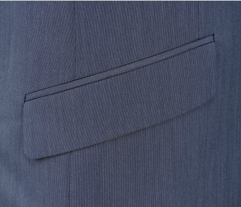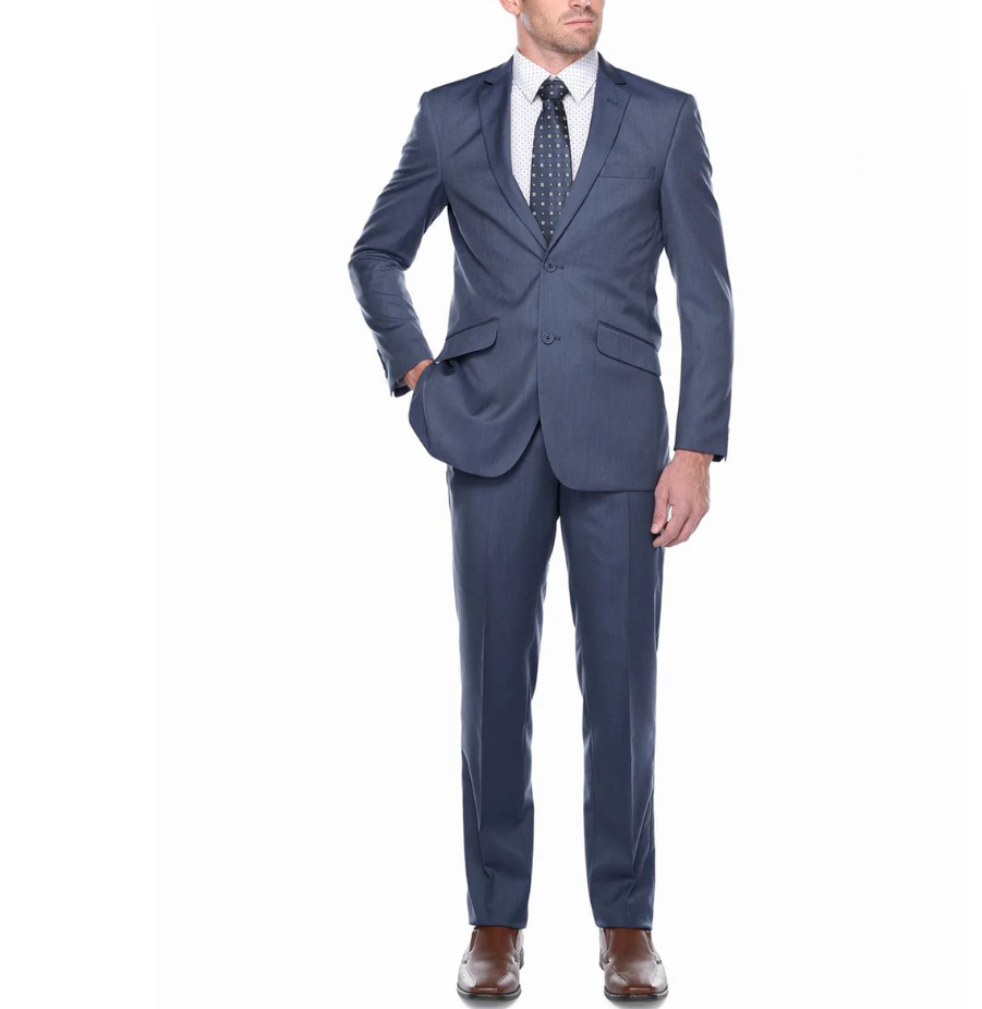 This classic two-piece suit delivers a polished, versatile look for any occasion. Made from a smooth, durable fabric, it features a modern two-button jacket with notch lapels and flap pockets, paired with flat-front trousers for a streamlined silhouette. The medium blue color offers a fresh alternative to navy, making it a smart choice for work, weddings, and formal events.