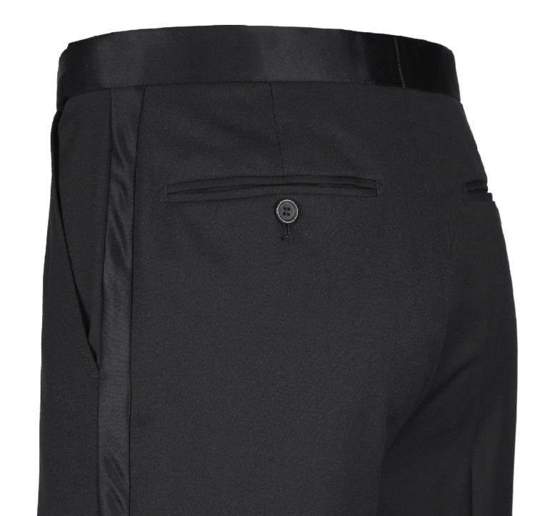 A busy social agenda requires a classic black tuxedo that'll always look sharp, and this Raphael tuxedo is faultlessly made for timeless elegance. This tuxedo is tailored from a polyester blend with satin peak lapels and has covered buttons for a final flourish. The flat front pants are trimmed with satin ribbon that runs down both legs, and the pants are left unhemmed to allow tailoring for your exact fit.