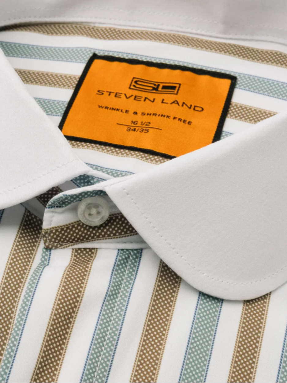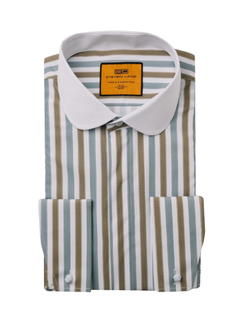 Steven Land Brown & Sage Striped Club Collar French Cuff 100% Cotton Wrinkle & Shrink Free Dress Shirt