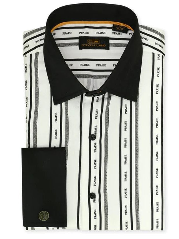 Steven Land Men's Black & White Striped Praise French Cuff 100% Cotton Dress Shirt