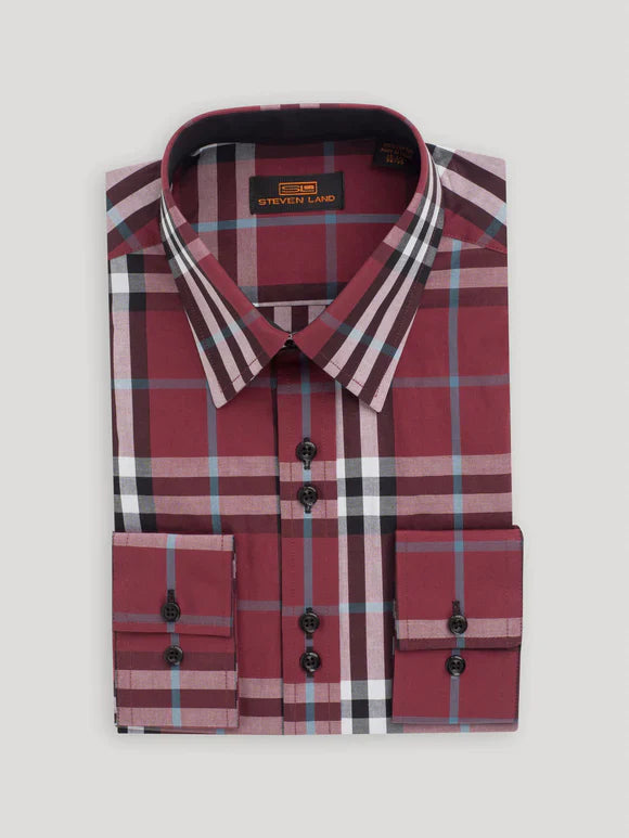 Steven Land Mens Classic Fit Burgundy Plaid 100% Cotton Dress Shirt
