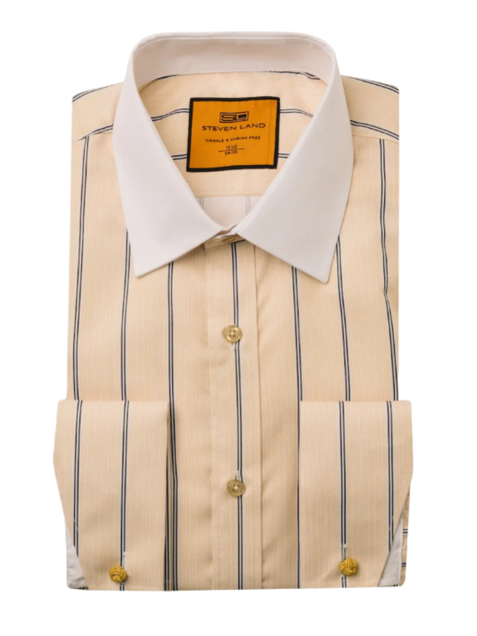 This Steven Land dress shirt features a yellow base woven with subtle vertical pinstripes and accented by navy double stripes that create a clean, structured look. A crisp white contrast collar and matching French cuffs add a sharp, formal edge, ideal for pairing with a suit or blazer. It's perfect for dressing up at formal events or adding character to a sharp business outfit.
