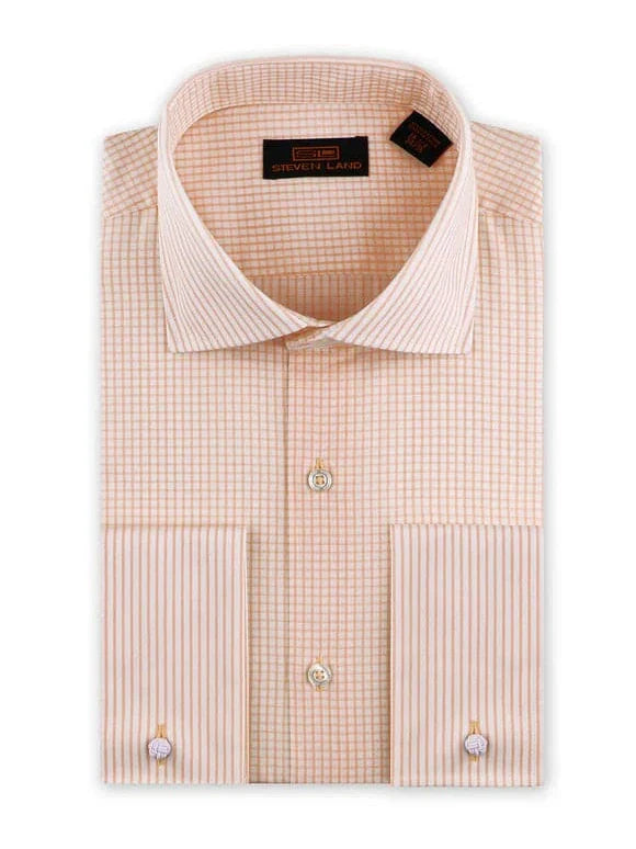 Steven Land Mens Peach Check Classic Fit 100% Cotton French Cuff Dress Shirt