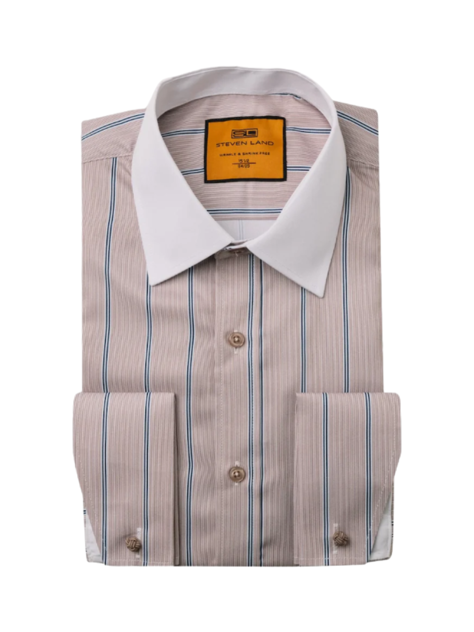 This Steven Land dress shirt features a brown base woven with subtle vertical pinstripes and accented by navy double stripes that create a clean, structured look. A crisp white contrast collar and matching French cuffs add a sharp, formal edge, ideal for pairing with a suit or blazer. It's perfect for dressing up at formal events or adding character to a sharp business outfit.
