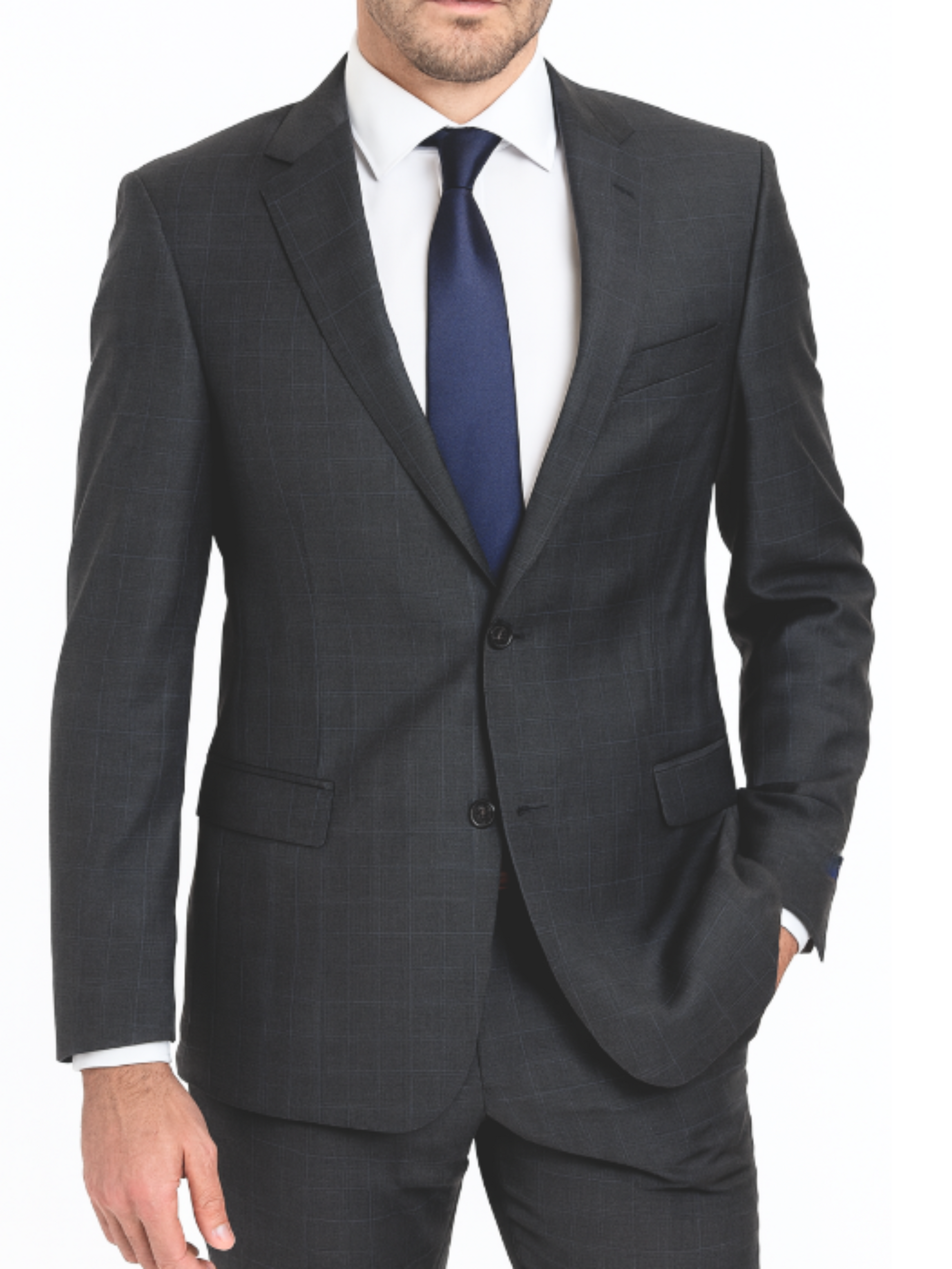 Tommy Hilfiger Charcoal Grey with Light Blue Windowpane Modern Fit Notch Lapel Wool Stretch Suit